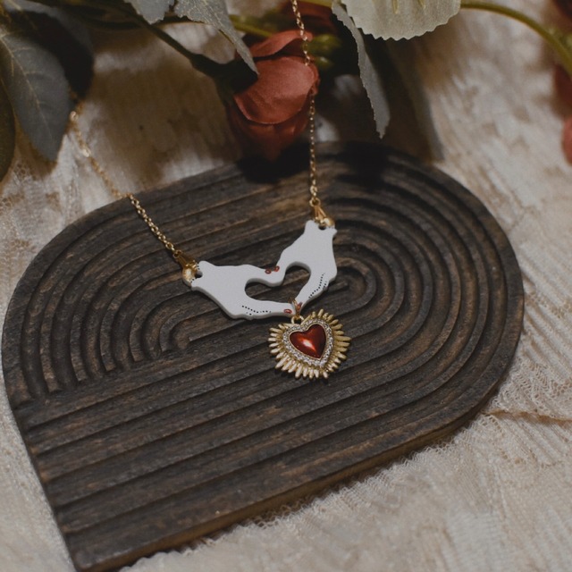 あの日、繋いだ手を離したあなたを許しはしない。 一生愛してあげる。 ── ── ── ギラギラと輝くハートと、愛を求める指先のネックレスです。 ── ── ── 蒐集場所:鍵をかけた秘密の小部屋 状態 :毒々しい 蒐集日 :幸せに満ちたある日 ── ── ── ▽サイズ:約5〜6cm ▽金具:真鍮 ===================== [ご注意] ※ サージカルステンレスではありません。金属アレルギーの方は着用をお控えください。 ※ 無理に曲げたり引っ張ったりすると、破損の原因になりますのでお気をつけください。