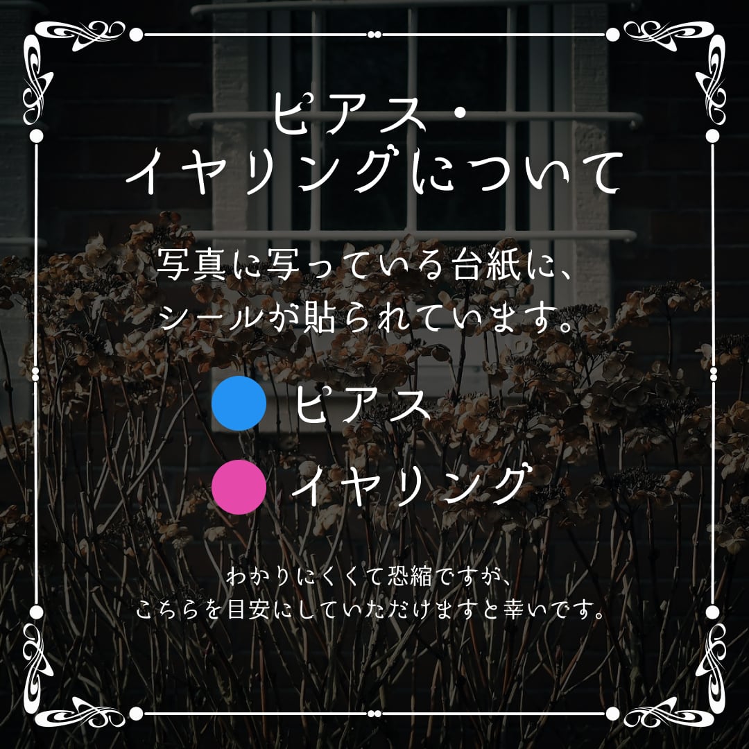 また、カートに商品追加を行う際の商品名にもピアス/イヤリングどちらの商品か記載を添えておりますので、ご安心ください。