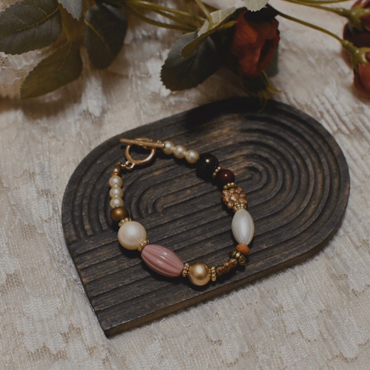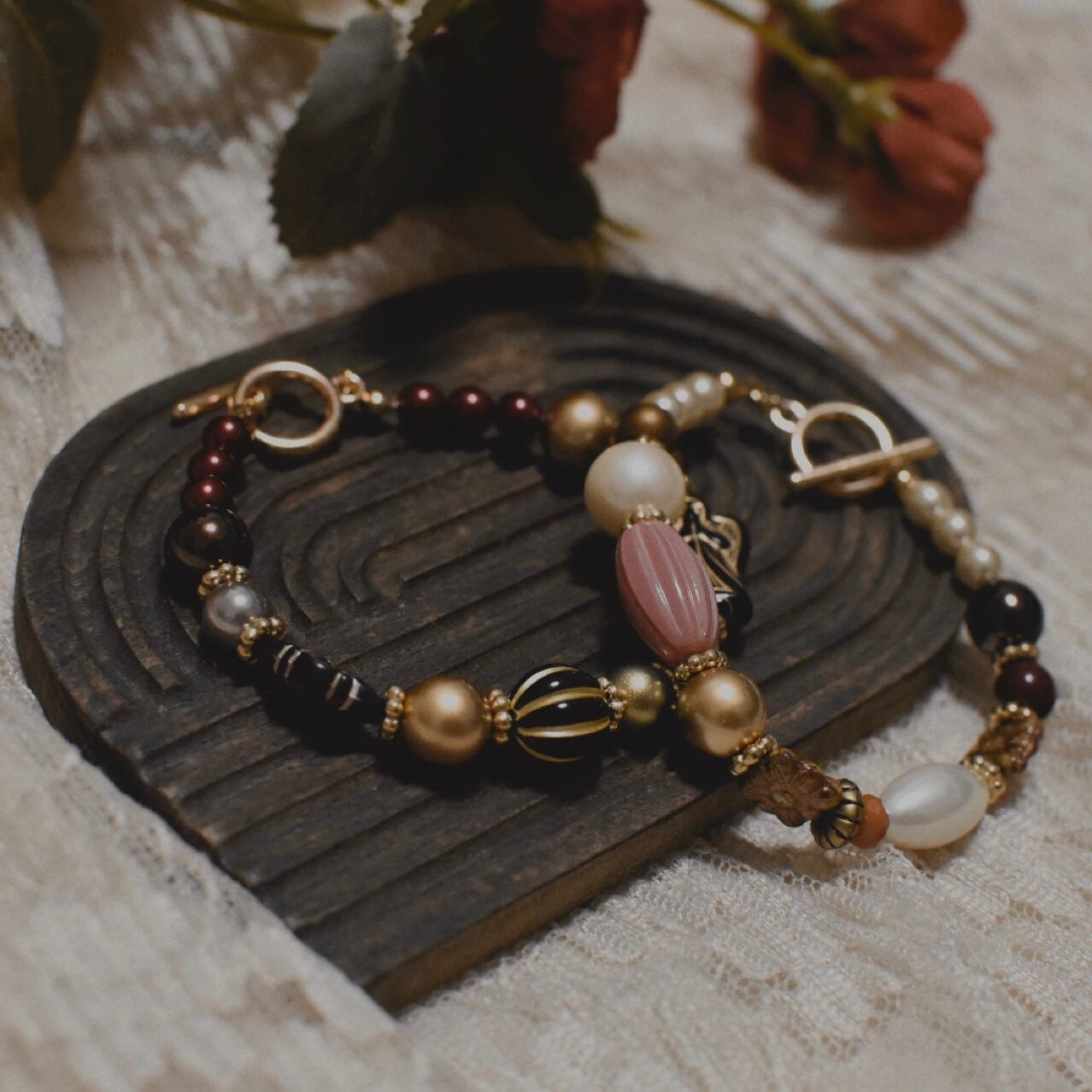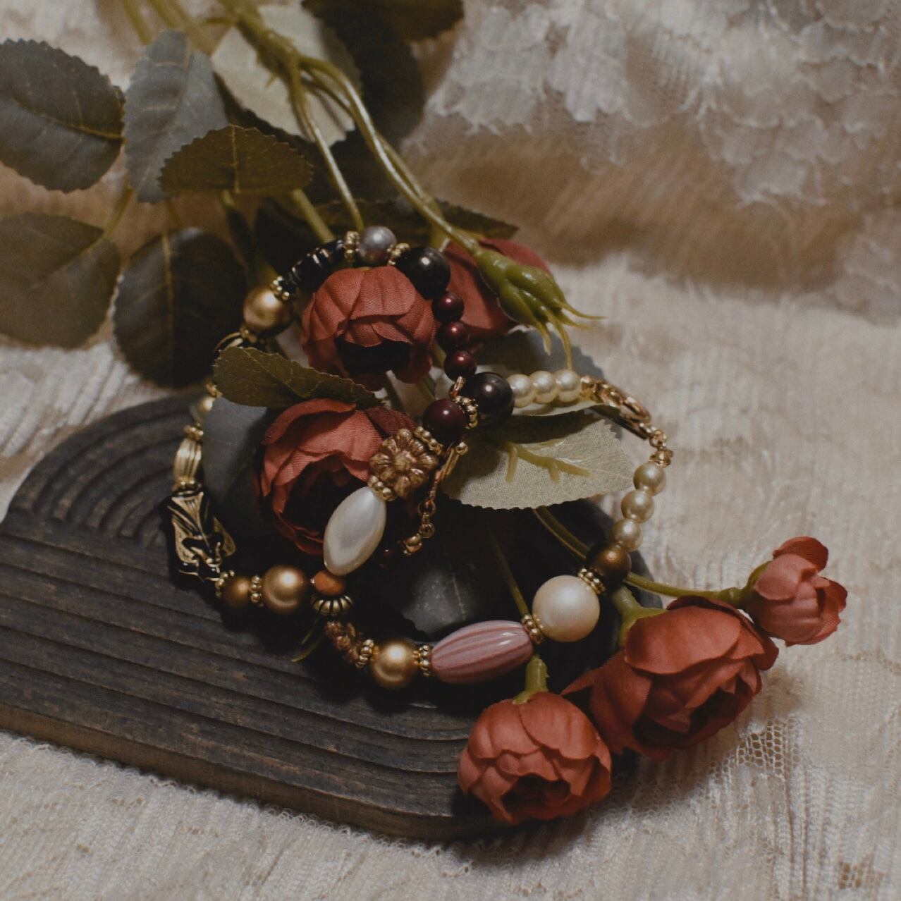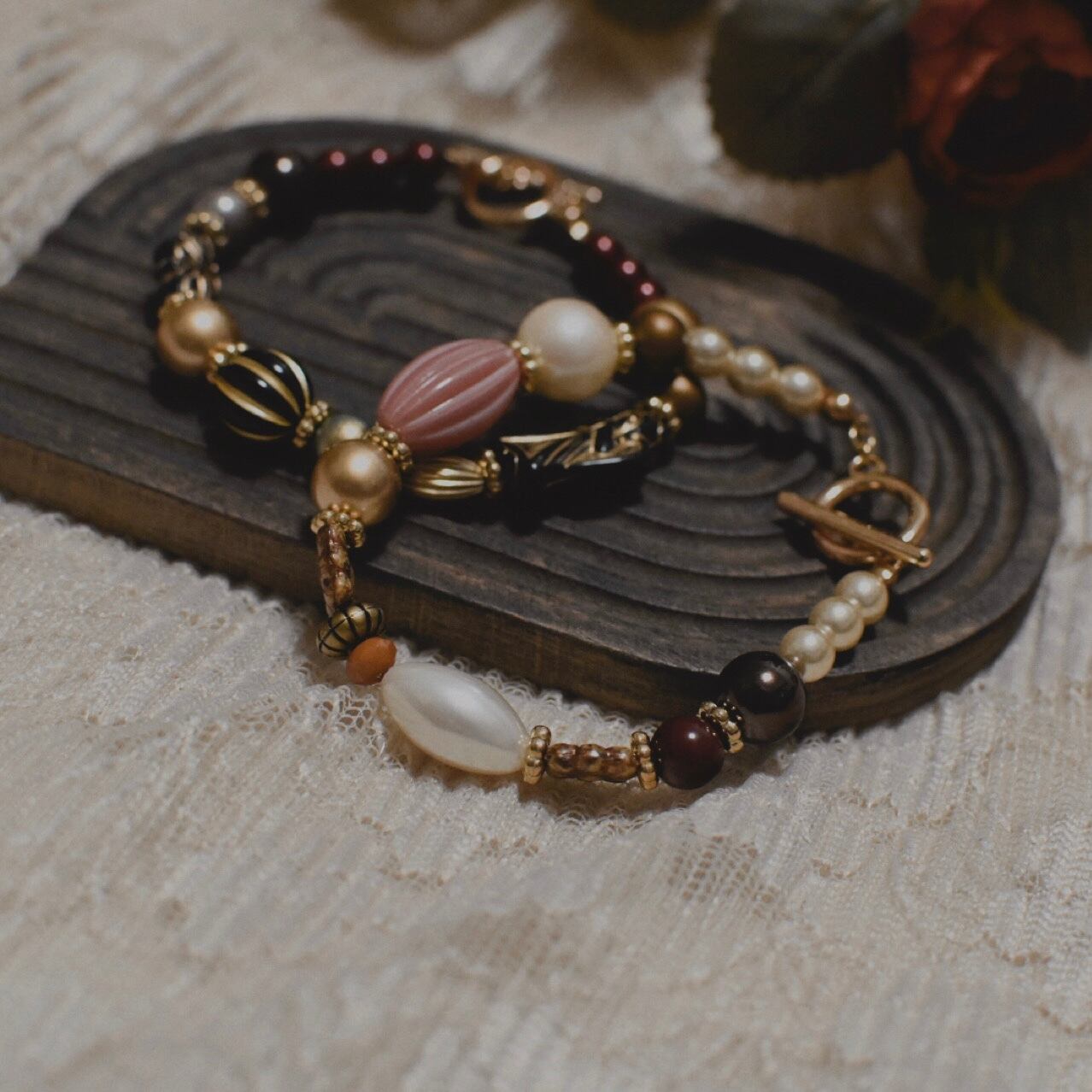 チョコレートのようなこっくりカラーのビーズを束ねたブレスレットです。