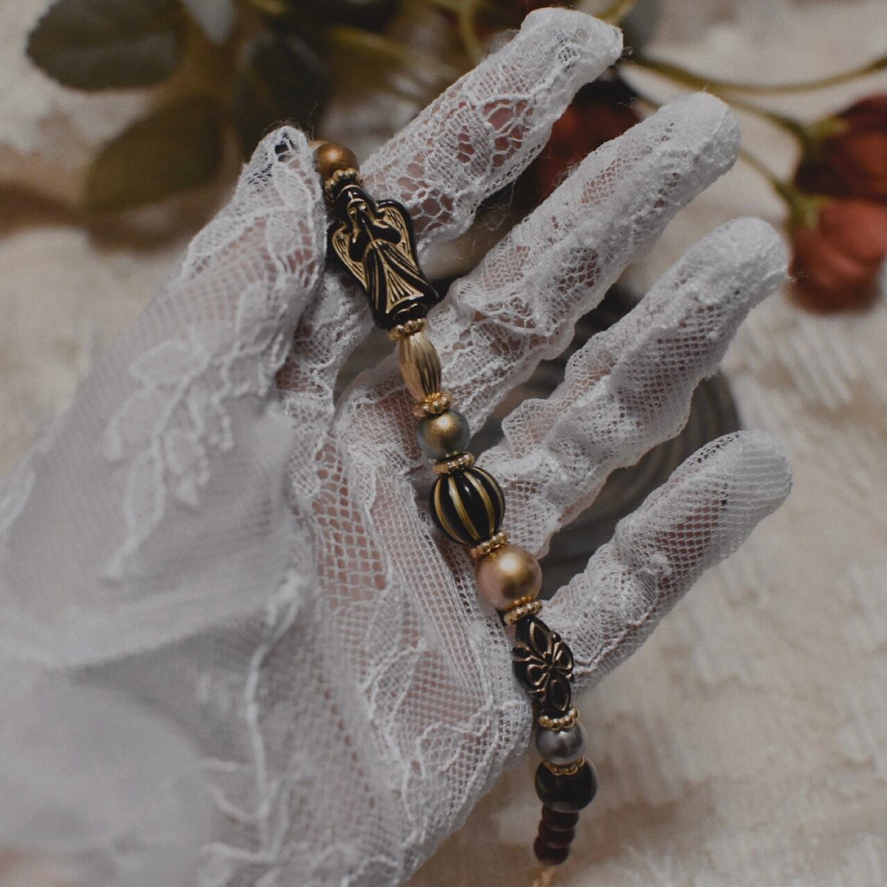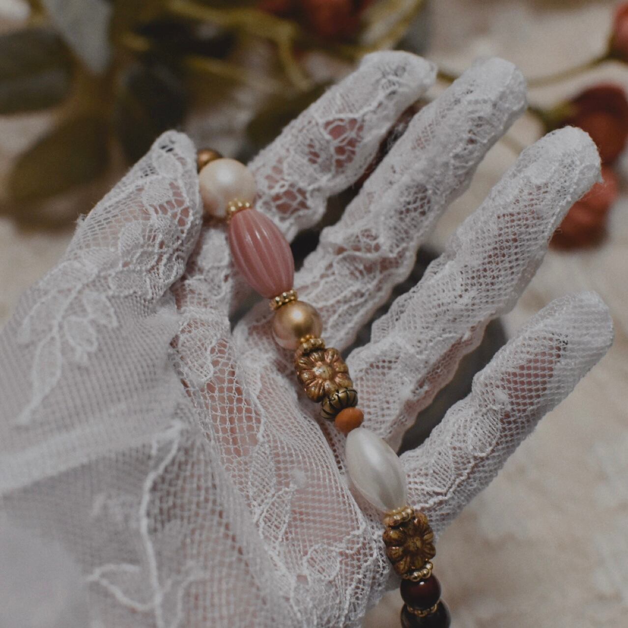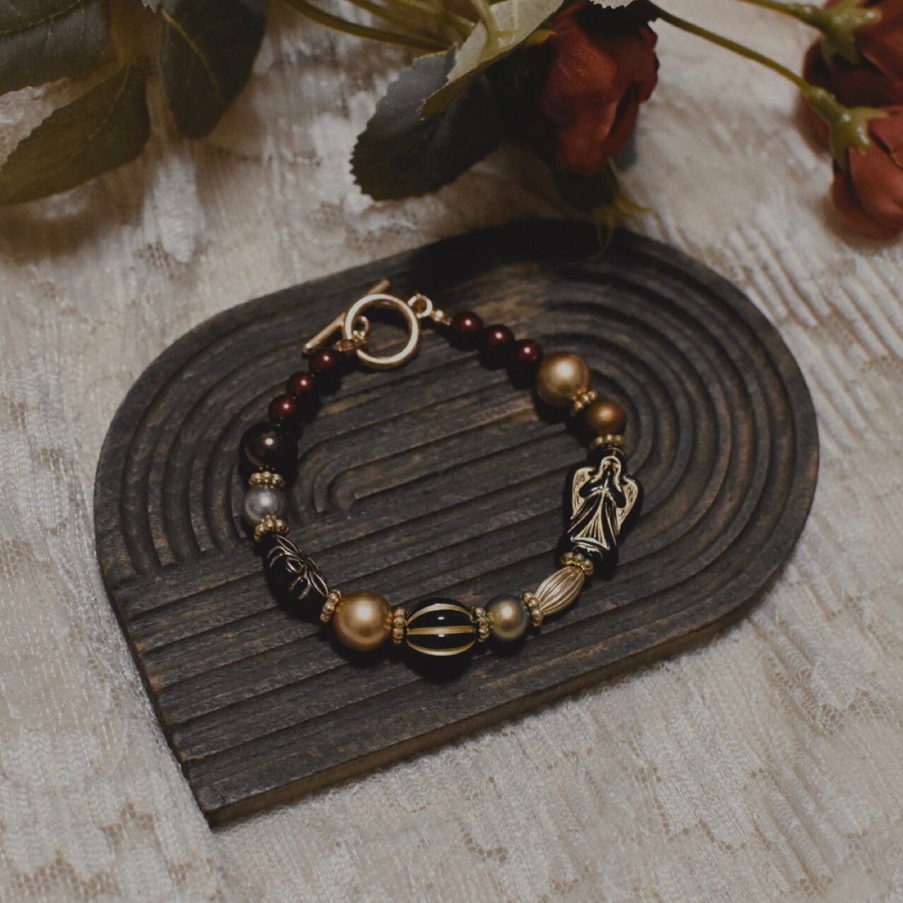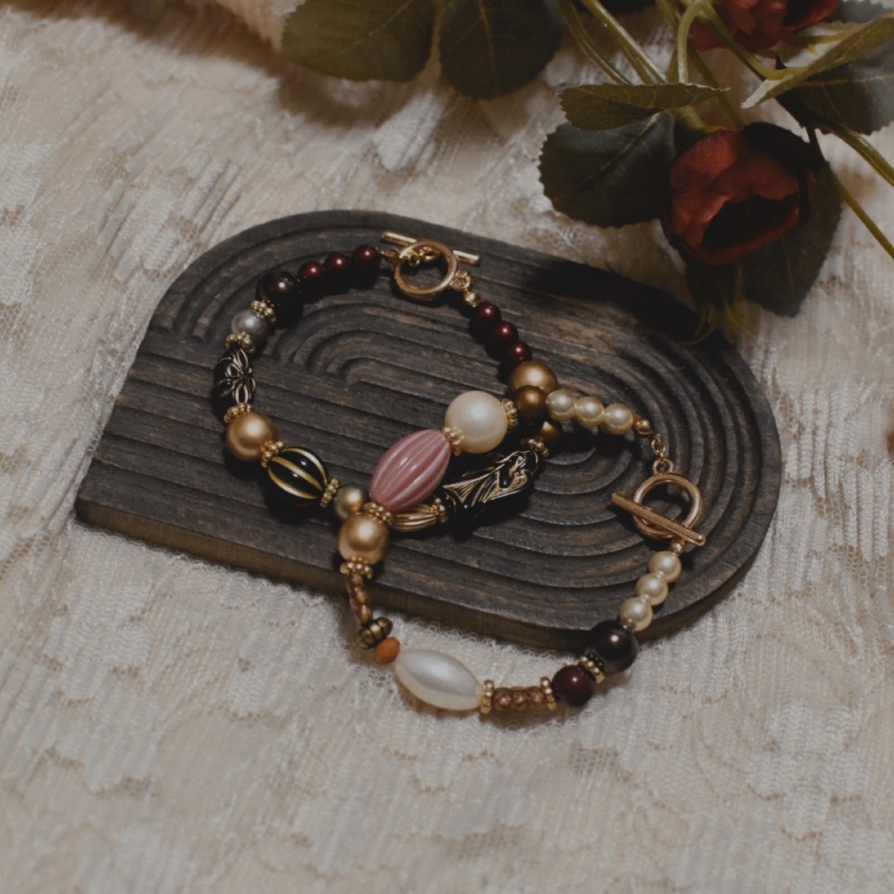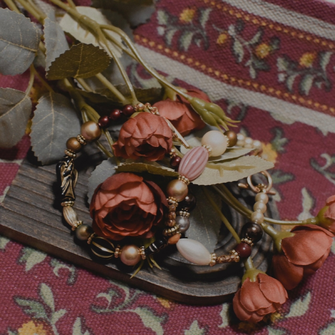 チョコレートのようなこっくりカラーのビーズを束ねたブレスレットです。