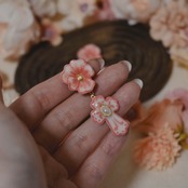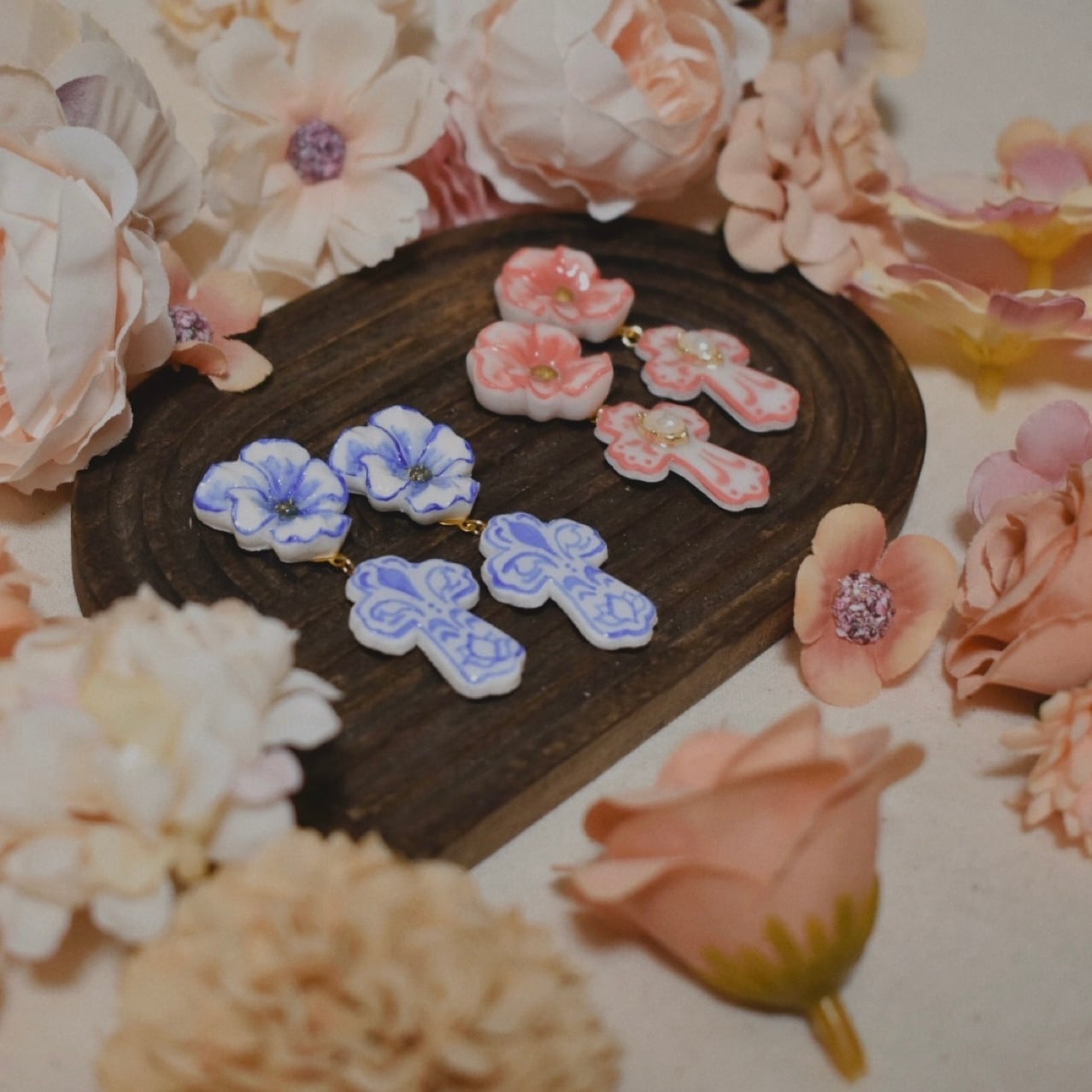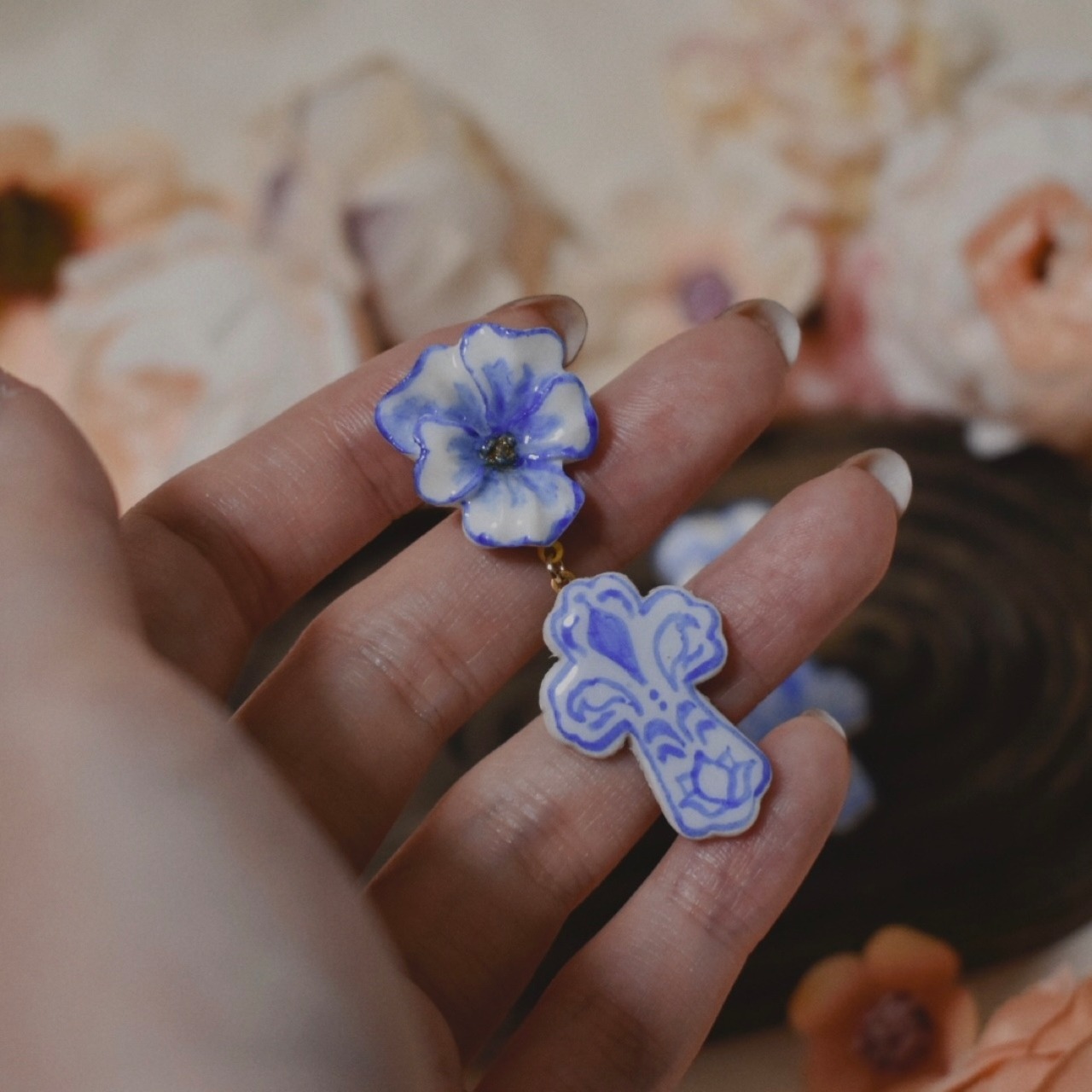 青磁器のようなパンジーと十字架。