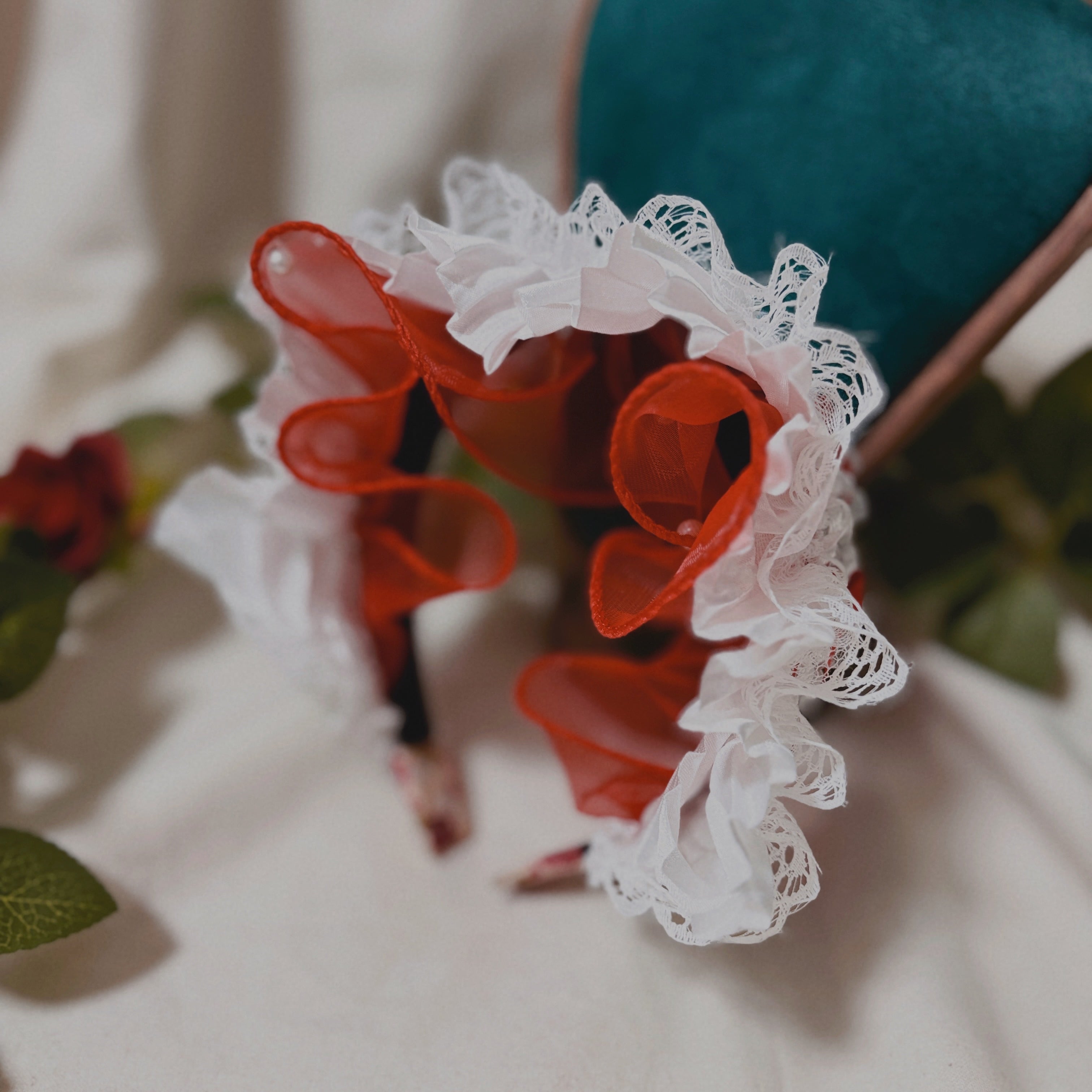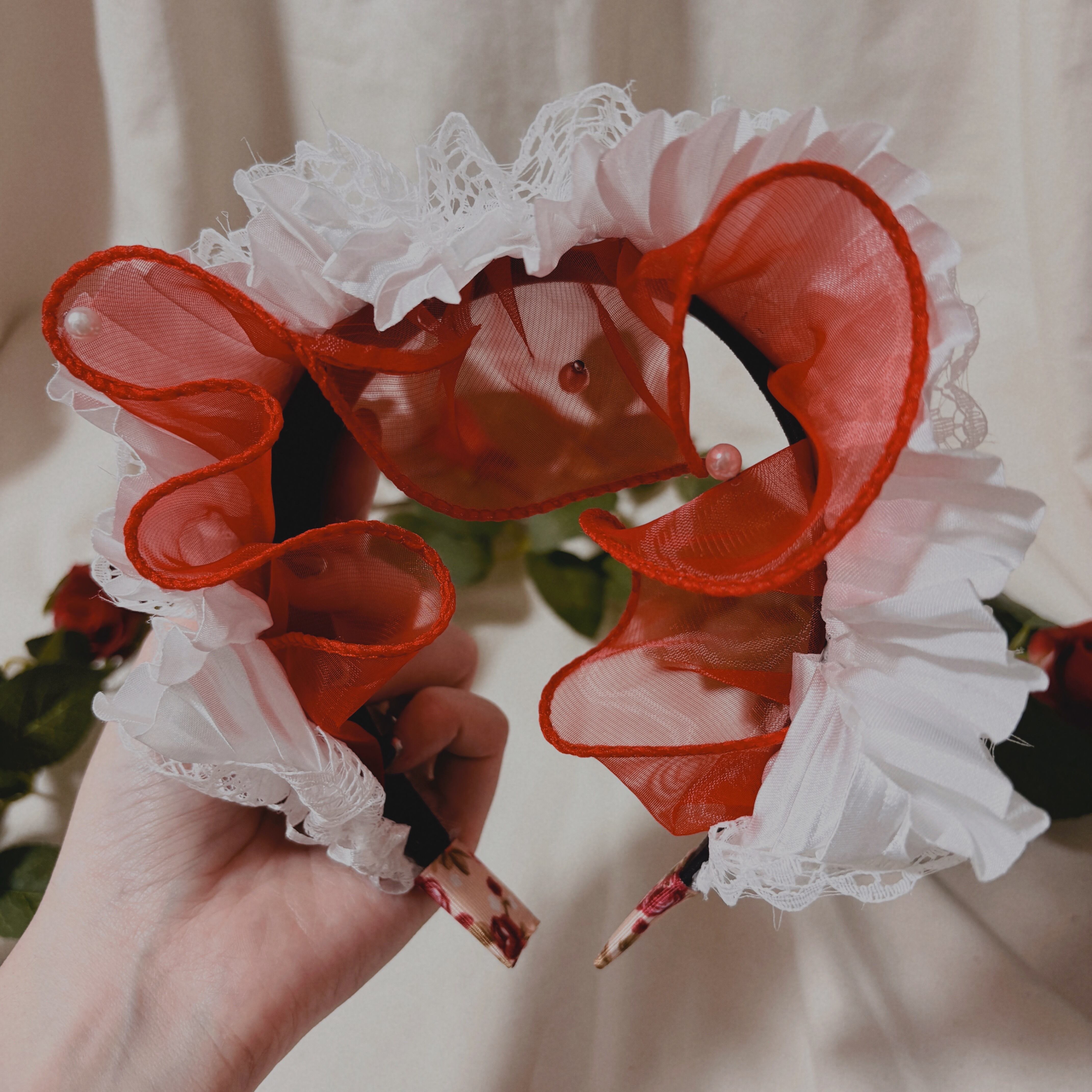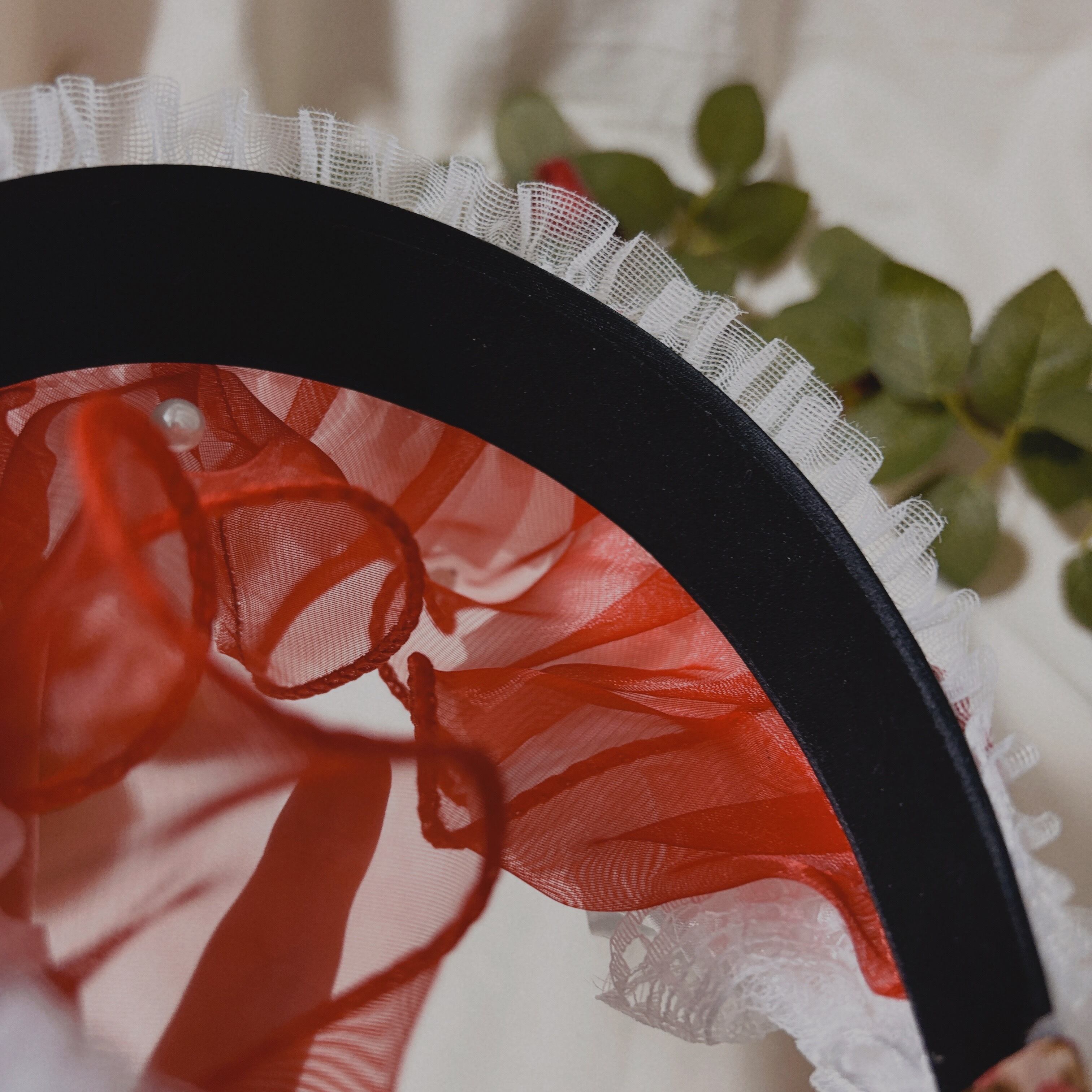 目を奪う鮮やかな赤が揺れるフリルカチューシャです。