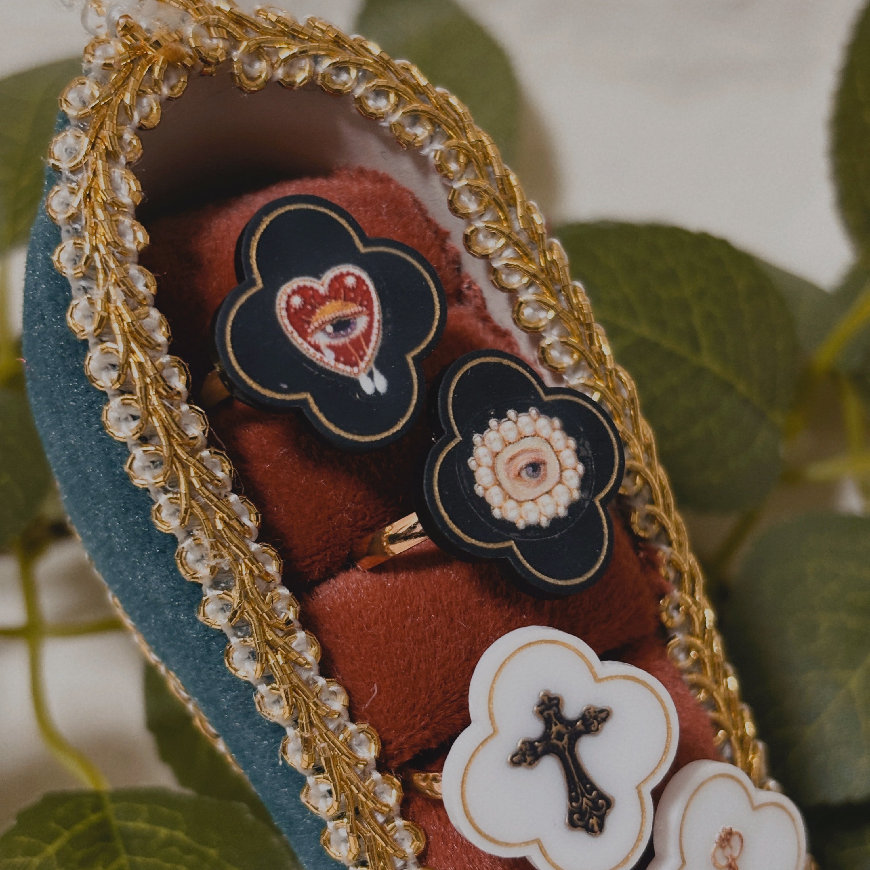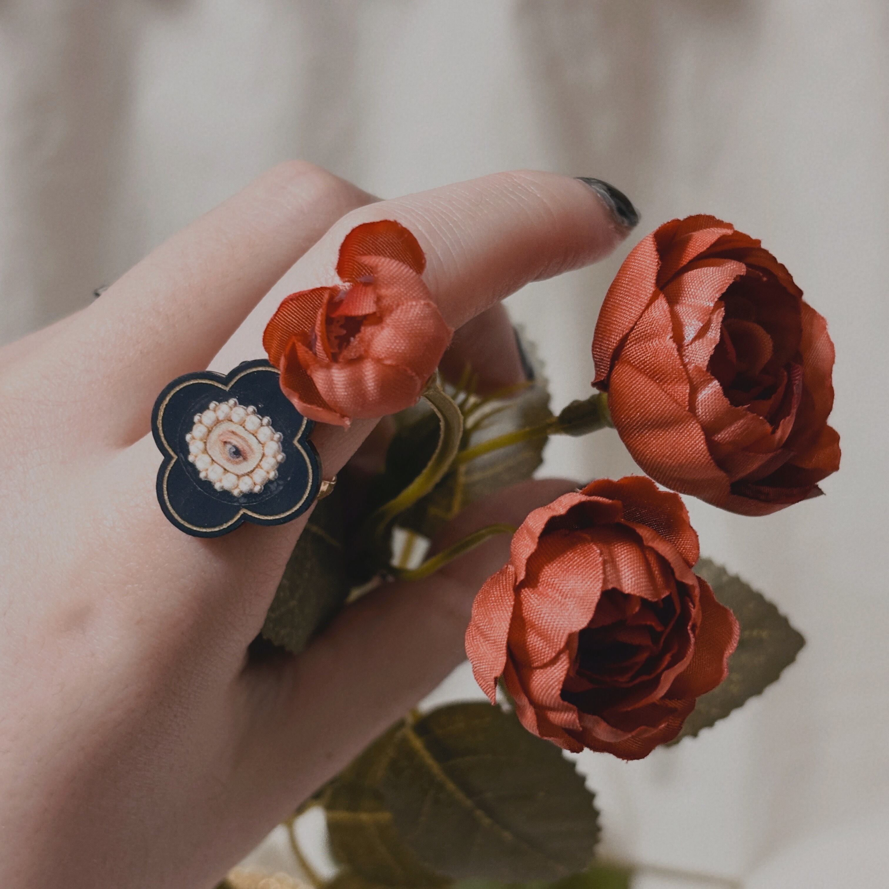 ゴシックなイラストがあしらわれたタイル型の指輪です。